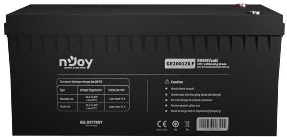 NJOY akkumulátor - GE20012KF (12V/200Ah, T11, zárt, gondozás mentes, GEL) EAN: 6422956013455 Típus: VRLA GEL Volt: 12V Tervezett élettartam: Max. : 12 év Csatlakozó Típusa: T11 Tulajdonságok: Teljesen zárt, gondozásmentes Alkalmazhatóság: Riasztó és biztonsági rendszerek, kábel TV, kommunikációs eszközök, nehéz szerszámok, irányító berendezés, orvosi eszközök, szünetm