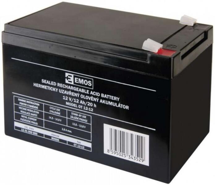 EMOS OT 12-12 12V 12Ah E12120 B9656 karbantartás mentes zselés akkumulátor Méret:(H)151mm × (Sz)98mm × (M)96mm Súly:3,3 kg - EZS (elektronikus biztonsági rendszerek) igen - EPS (elektronikus tűzvédelmi rendszerek) igen - UPS (szünetmentes tápegység) igen - fűnyíró traktorok nem - tölthető elemlámpa nem - babahordozók - pl. Peg-Pérego igen - vészvilágítás nem - tartalék ak