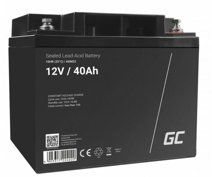 Akkumulátor / akkumulátor Green Cell AGM22 AGM A 12V 40Ah 12V kapacitású akkumulátor minőségi anyagokból készült, az AGM technológián alapulva, azaz olyan szerkezetben, amely üveggyapot -elválasztót tartalmaz, amely elnyeli az elektrolitot. Az AGM előnyei: karbantartásmentes működés, használat bármilyen helyzetben, ellenállás szélsőséges hőmérsékleteknek, a megújuló