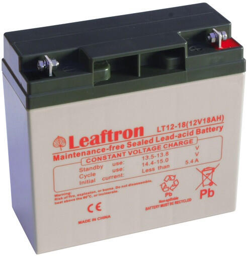 12V 18Ah Leaftron LT12-18 AGM technológiás, szeleppel vezérelt (VRLA) zártrendszerű gondozásmentes (zselés) ólomsavas akkumulátor. A Leaftron márka egy megbízható energiatároló akkumulátor általános célú használatra mely ismételten újratölthető. Szigetelt tömítéssel vízszintes, függőleges és oldalsó irányban is elhelyezhető, biztonságát és funkcióit ez nem bef