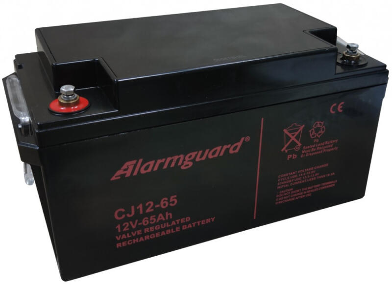 Alarmguard CJ12-65 12V 65Ah-s zártrendszerű, AGM technológiás, szeleppel vezérelt (VRLA), ismételten újratölthető gondozásmentes (zselés) ólomsavas akkumulátor. Szigetelt tömítéssel vízszintes, függőleges és oldalsó irányban is elhelyezhető így biztonságát és funkcióit ez nem befolyásolja. Várható élettartama 3-5 év (Standby - Készenléti üzemmódban 5 év), mely
