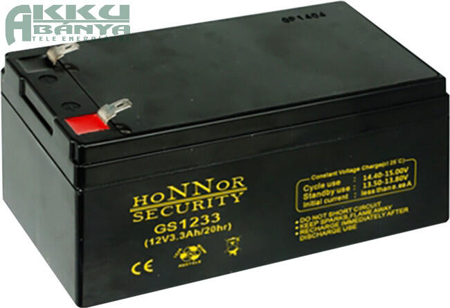 12V, 3.3Ah, zselés, ólom akkumulátor, gondozásmentes, 134x67x61mm, 1.2kg. - Felitatott, üvegszálas technológiával (AGM) készült savas, ólom akkumulátor. - Névleges feszültség: 12V. - Névleges kapacitás: 3.3Ah. - Elektrolit: kénsav. - Epoxigyanta szigetelés. - Réz csatlakozók. - Ólom-oxid pozitív pólus. - Ólom negatív pólus. - ABS műanyag tartály és keret. - Ciklikus h