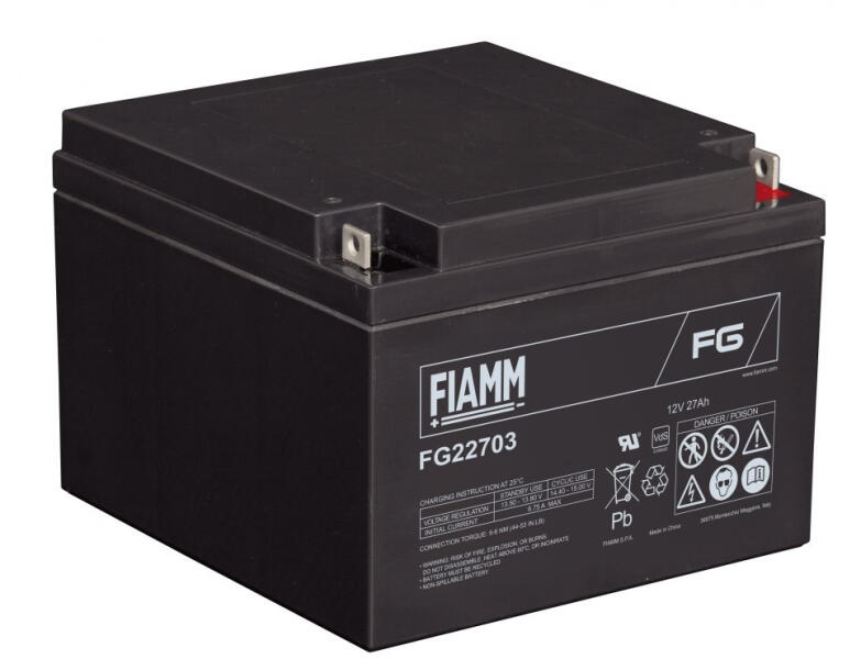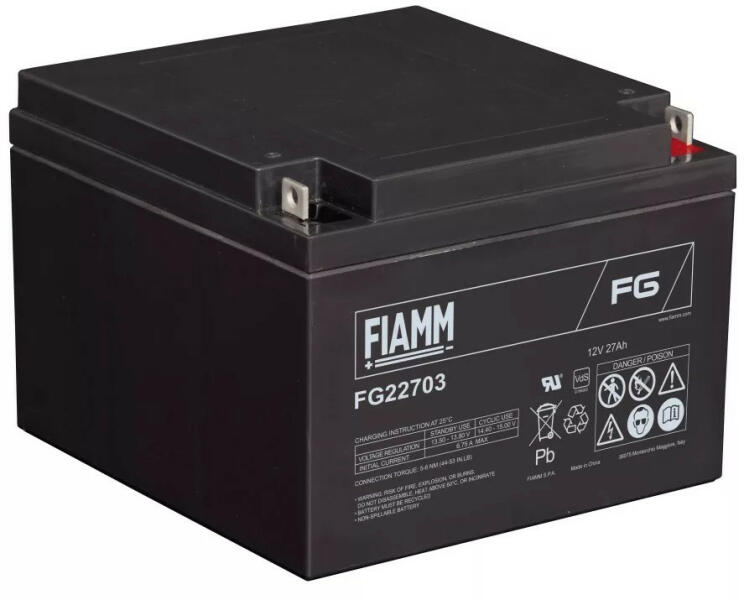 A FIAMM FG22703 egy nagyobb kapacitású, ipari felhasználásra szánt zárt (VRLA), zselés ólomakkumulátor. Ideális közepes és nagyobb energiaigényű alkalmazásokhoz, mint például szünetmentes tápegységek (UPS), vészvilágítás vagy orvosi eszközök. Műszaki adatok : Feszültség : 12 V Kapacitás : 27 Ah Technológia : Zárt, gondozásmentes ólomakkumulátor zselés elektrolit