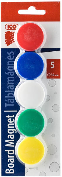 ICO TÁBLAMÁGNES 30MM 5DB/CSOMAG 5SZÍN VEGYESEN Táblamágnes. Acél táblafelületeken rögzíthető mágnes korongok. Katalóguskód: 17433