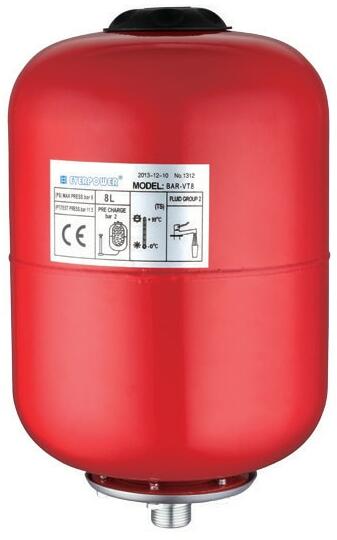 Everpower BAR-VT12 függőleges tágulási tartály, 12 liter, 6 bar 12 literes függőleges tágulási tartály zárt fűtési rendszerekhez; Cserélhető EPDM membrán; Elektrosztatikus közegben festve; Temp. maximum = 110˚C; Üzemi nyomás = 6 Bar; Rozsdamentes acél karima.