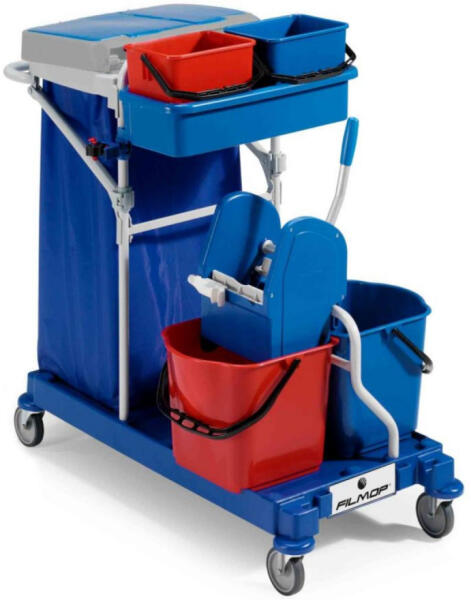 A táskatartó különböző változatokban kapható: 120 L, 2x60 L és 40 L+80 L. Praktikus műanyag kosár a tisztítóeszközök szállításához. 6 literes vödrök különböző színekben a különböző vegyszerek és a számos tisztítóeszköz szállítására és szükség esetén szétválasztására. 35 literes medence szitával, amelyet előre impregnált mopfejek szállítására va