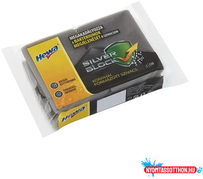 Mosogatószivacs 2 db/csomag formázott antibakteriális Silverblock Hewa JellemzőkHosszú élettartamú, Rendkívül hatékony, Megakadályozza a baktériumok megjelenését a szivacson, Takarítás és higiénia a Hewa új Silver Block termékeivel!Termék információk Termékjellemzők A termék biocid anyagot cink-piritiont és tiabendazolt tartalmaz, így megakadályozza azoknak a baktériu
