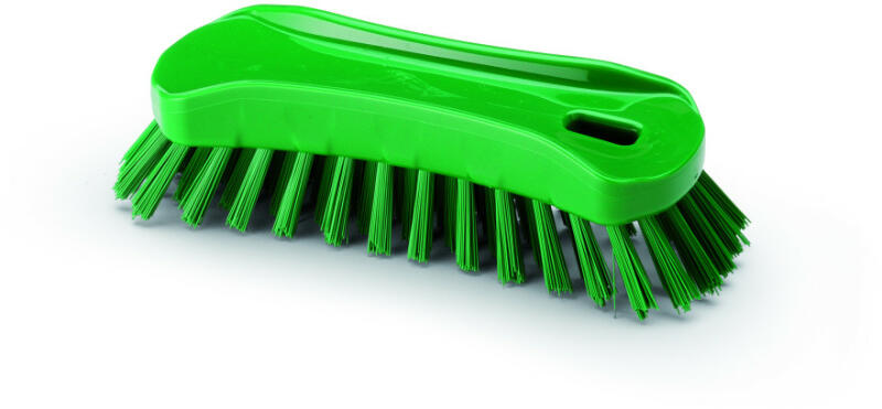 - ergonómikus kézi kefe - zöld sörtével - közepes sörtéves (0,75 mm) - HACCP rendszerbe illeszthető - sörte hosszúság 30 mm - 130 °C -ig hőálló - élelmiszeripari berendezések alkatrészeinek, rácsók, feldolgozó felületek tisztítására - 6 db / karton - 180x65x55 mm