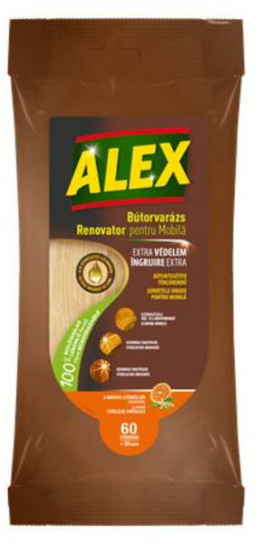 Nedves törlőkendő bútorokhoz, ALEX, 30 db (KHT756) Az Alex Méhviaszos Bútortisztító kendő használható lakkozott fabútorok, ablak- és ajtókeretek, fa képkeretek tisztítására. - eltávolítja az ujjlenyomatokat - a fa természetes szérumával - maximális hidratálás - azonnali ragyogás - lassítja a por lerakódását -nyom nélkül szárad - 100%-ban természetes, biológiaila