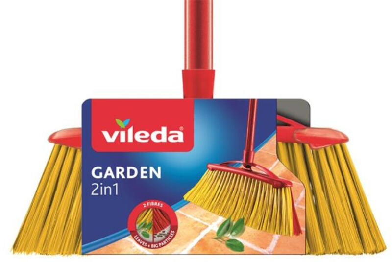 Partvis, kültéri, nyéllel, VILEDA 2in1 Garden (KHTV12) Kétféle szál tökéletes kombinációja: a kevésbé sűrű, viszont merev piros sörték segítenek a nagyobb, méretű anyagok összeszedésében, míg a sűrűbb és rugalmasabb sárga sörték a kisebb anyagok takarítását teszik lehetővé. -mindenféle kültéri padlóburkolat – például csempe, beton, szennyeződés vagy növ