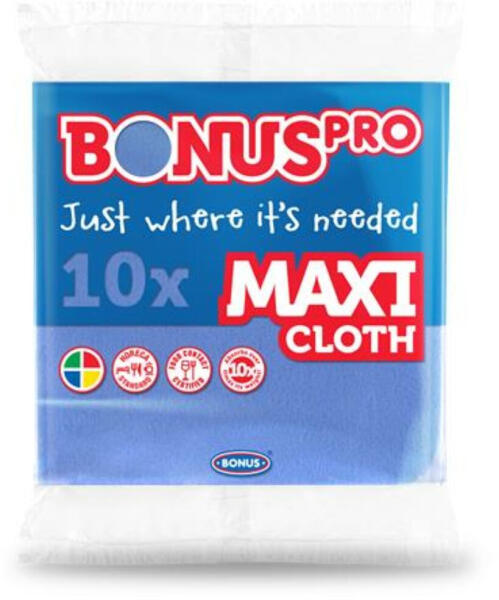 Törlőkendő, univerzális, 10 db, BONUS Professional Maxi, kék (KHT893) A BONUSPRO MAXI törlőkendőt maximálisan a HoReCa szegmens igényeinek megfelelően alakítottuk ki. Mérete 38X40cm, így hatásosan tisztítja a nagyobb felületeket, legyen szó pultokról, polcokról, állványokról vagy más tisztítandó területről. A professzionális felhasználók – éttermek, hotelek, étke
