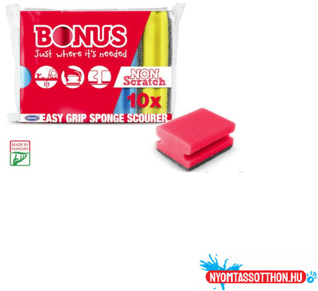 Mosogató szivacs 10 db/csomag formázott Bonus B323 Ez a mosogatószivacs egyszerű és nagyszerű. Hogy miért? Mert a mosogatás során ugyanúgy megállja a helyét, mint a takarítás során. Legyen szó a fürdőszobacsempe lemosásáról vagy a tepsibe kozmált ételmaradékokról, a BONUS formázott mosogatószivacs garantáltan elbánik a szennyeződésekkel. Vízkő, tűzhely, üvegfelü