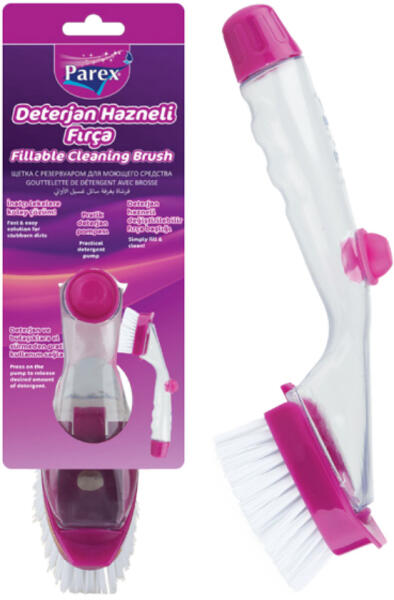 Gyors és egyszerű megoldás a makacs foltok ellen! Használati utasítás: Távolítsa el a nyél tetején található kupakot, majd töltse fel mosogatószerrel, vagy mosogatószeres vízzel. Nyomja meg a gombot a kívánt mennyiségű mosószer adagolásához. Használaton kívül a fogantyút a kefés oldalával felfelé tárolja, hogy elkerülje a mosogatószer kiszivárgását. Figyelmeztet