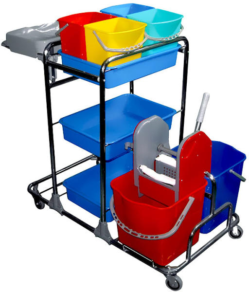 - Kombi takarítókocsi krómvázas 2 db 25 literes és 4 db 5 literes vödörrel - krómozott acél váz - önbeálló kerekek - Tartozékok: - 2 db 25L-es vödör - 4 db 5L-es vödör - 1 db mopprés - eszköztartók - zsáktartó Professzionális takarítókocsi (felmosó kocsi) intézmények és irodaépületek rendszeres takarításához. Erős krómozott acél váz. A két db 25L-es vödör