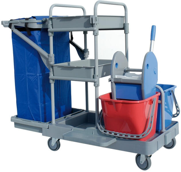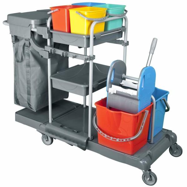 Szervizkocsi (takarítókocsi) ALL-IN - minden lehetséges tartozékkal ellátott szervizkocsi, - kétvödrös, moppréses felmosó rész, - négy vödrös, szín kódolt ablak- és bútortisztító rész, - két polccal és nyél rögzítő fülekkel, - 120 literes szövet szemeteszsák tartóval, - a takarítókocsi 4 darab önbeálló 10 cm átmérőjű kerékkel rendelkezik, - a szervizkocsi