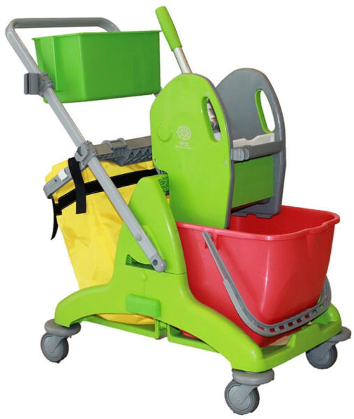 Egyvödrös felmosókocsi (takarítókocsi) - egy osztott vödörrel rendelkező felmosóvödör, - a megosztásnak köszönhetően a szennyezett és tiszta víz nem keveredik egymással, - a vödör erős műanyag moppréssel (facsaró) rendelkezik, - a felmosókocsi 4 db önbeálló kerékkel van ellátva, - kiválóan alkalmas nagyobb háztartások, kisebb irodák és üzletek takarításához.