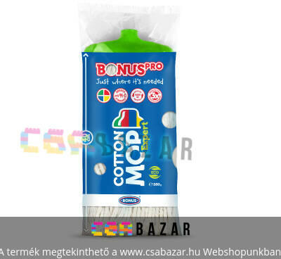 Pamut felmosófej, Mop pamutfej 350gr méretben, szálhossz: 40 cm. A BONUSPRO CottonMOP Expert a HoReCa szegmens igényeinek megfelelően biztosít ragyogó tisztaságot a padlófelületeken. A nagyméretű kialakításnak köszönhetően a hagyományos felmosófejekkel összehasonlítva egységnyi felületet kevesebb törléssel tisztíthatunk meg, így kiemelkedően hatékony. Ideális garázso
