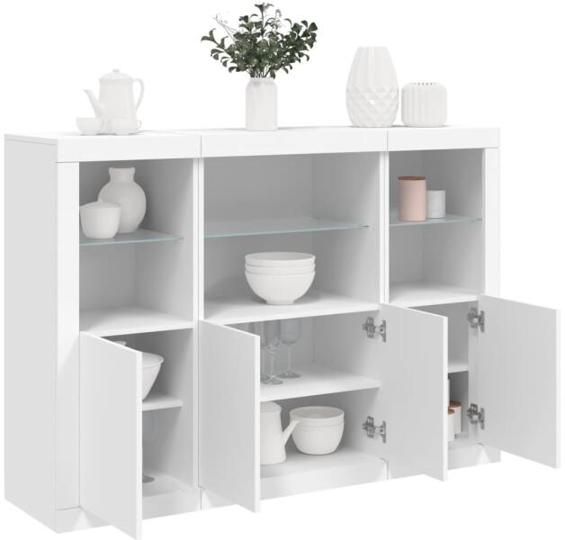 Díszítse fel szobáját ezekkel a modern, LED-es lámpákkal felszerelt tálalószekrényekkel, melyek könnyedén beleolvadnak otthona bármely stílusába. Tartós anyag: A szerelt fa kivételes minőségű, sima felületű, szilárd, stabil, és ellenáll a nedvességnek. Bőséges tárolóhely: A tálalószekrények rengeteg tárolóhelyet biztosítanak folyóiratai, könyvei, távirányít
