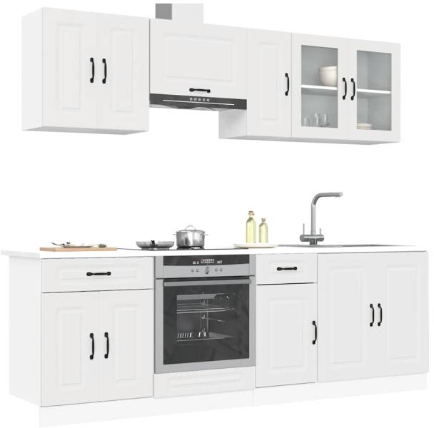 Ez az elegáns kialakítású, nyolcrészes konyhai szekrénygarnitúra optimalizálja konyhája terét, és bőséges tárolóhelyet biztosít személyes tárgyainak! Stabil és tartós anyag: A szerelt fa tartós és stabil anyag sima felülettel, amely ellenáll a nedvességnek, a vetemedésnek és a hasadásnak, így megbízható választás különféle célokhoz. Bőséges tárolóhely: A ko
