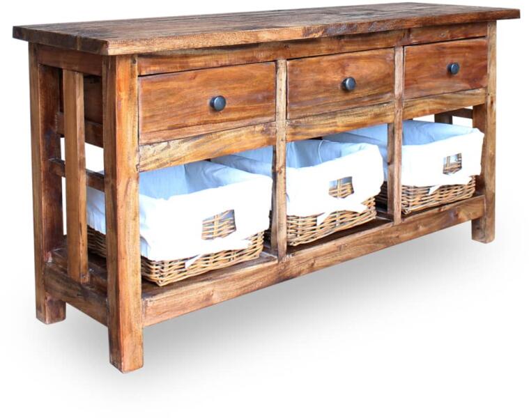 Ez a komód rusztikus bájt kölcsönöz otthona dekorációjának. Tömör, újrahasznosított fából készült, a kopott stílus minden egyes darabnak egyedi megjelenést kölcsönöznek, hozzájárulva látványos vintage megjelenéséhez. 3 fiókkal és 3 kivehető rattan kosárral rendelkezik. Robusztus és stabil: Ez a tömör fa komód rendkívül tartós és stabil. A mahagóni egy trópu