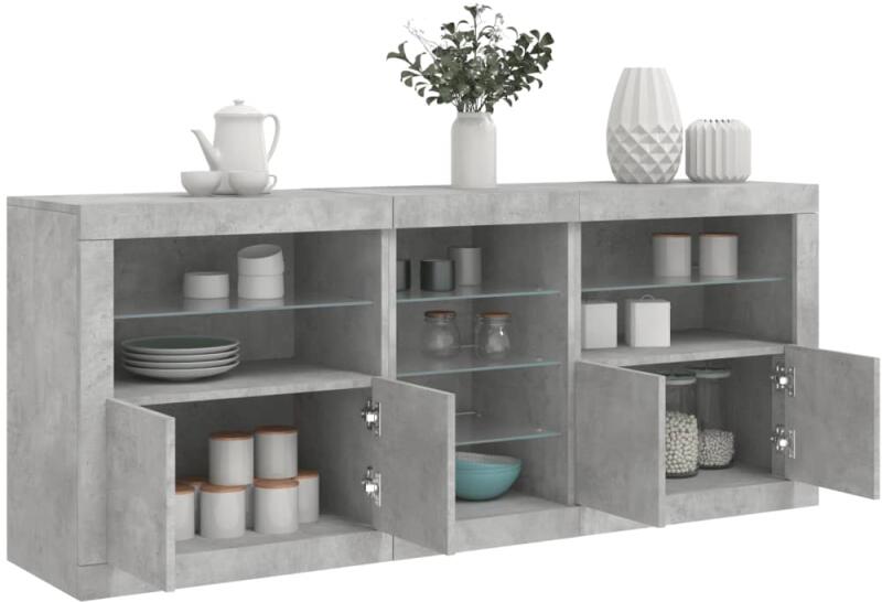 Díszítse fel szobáját ezzel a modern, LED-es lámpákkal felszerelt tálalószekrénnyel, mely könnyedén beleolvad otthona bármely stílusához. Tartós anyag: A szerelt fa kivételes minőségű, sima felületű, szilárd, stabil, és ellenáll a nedvességnek. RGB LED-világítás: A tálalószekrény élénk RGB LED-világítással lett felszerelve. A sokféle testre szabható menü seg