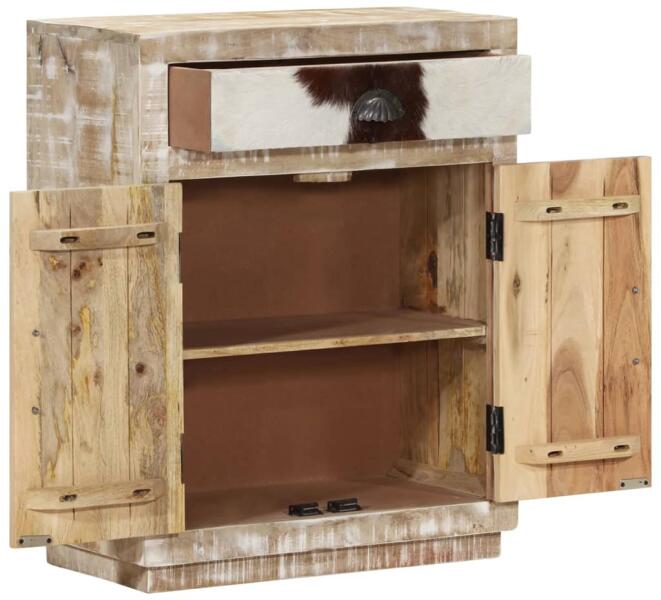 Ez az elegáns tálalószekrény mutatós kiegészítője lehet otthonának. A szekrény tömör mangófából, egy sűrű erezetű keményfából készült. A nyers mangófa nemcsak a ránehezedő súlyt bírja el, de időtálló is. Így ez a gyönyörű kialakítású öltözködőasztal rendkívül stabil, tartós és mutatós. A kifinomult faerezetnek köszönhetően minden bútordarab egyedi