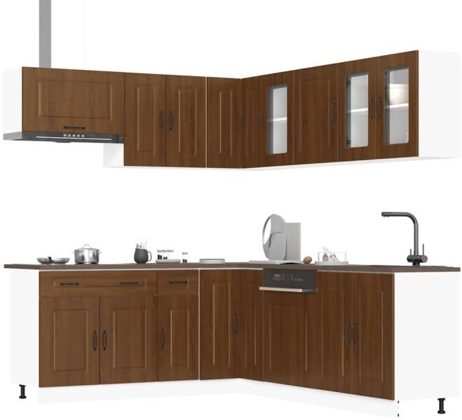 Ez az elegáns kialakítású, tizenegy részes konyhai szekrénygarnitúra optimalizálja konyhája terét, és bőséges tárolóhelyet biztosít személyes tárgyainak! Stabil és tartós anyag: A szerelt fa tartós és stabil anyag sima felülettel, amely ellenáll a nedvességnek, a vetemedésnek és a hasadásnak, így megbízható választás különféle célokhoz. Bőséges tárolóhely: