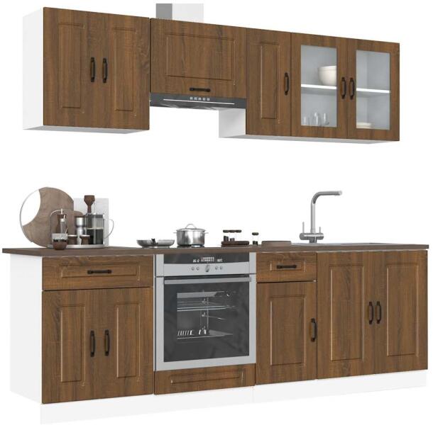 Ez az elegáns kialakítású, nyolcrészes konyhai szekrénygarnitúra optimalizálja konyhája terét, és bőséges tárolóhelyet biztosít személyes tárgyainak! Stabil és tartós anyag: A szerelt fa tartós és stabil anyag sima felülettel, amely ellenáll a nedvességnek, a vetemedésnek és a hasadásnak, így megbízható választás különféle célokhoz. Bőséges tárolóhely: A ko
