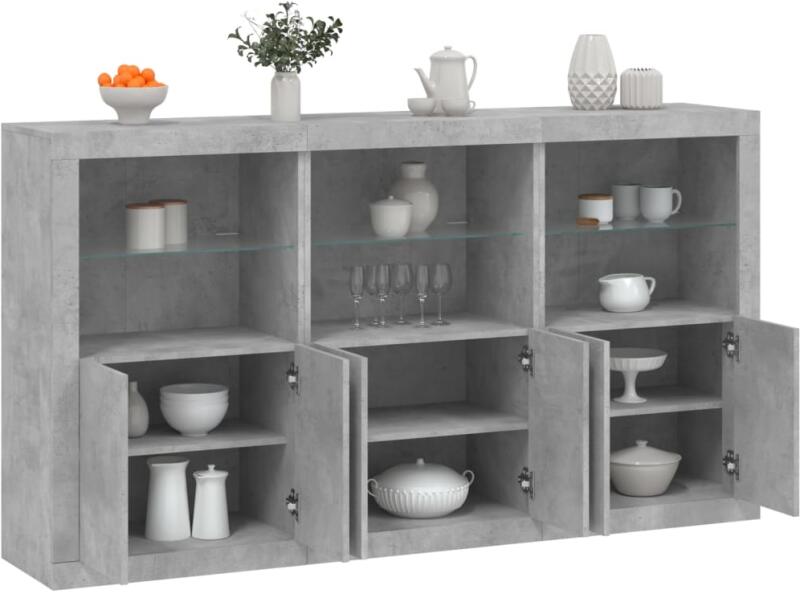 Díszítse fel szobáját ezzel a modern, LED-es lámpákkal felszerelt tálalószekrénnyel, mely könnyedén beleolvad otthona bármely stílusához. Tartós anyag: A szerelt fa kivételes minőségű, sima felületű, szilárd, stabil, és ellenáll a nedvességnek. RGB LED-világítás: A tálalószekrény élénk RGB LED-világítással lett felszerelve. A sokféle testre szabható menü seg