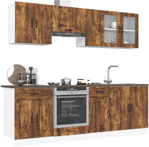 Ez az elegáns kialakítású, nyolcrészes konyhai szekrénygarnitúra optimalizálja konyhája terét, és bőséges tárolóhelyet biztosít személyes tárgyainak! Stabil és tartós anyag: A szerelt fa tartós és stabil anyag sima felülettel, amely ellenáll a nedvességnek, a vetemedésnek és a hasadásnak, így megbízható választás különféle célokhoz. Bőséges tárolóhely: A ko