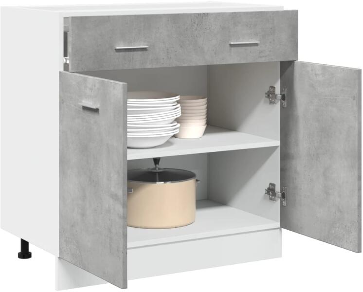 Ez az alsó fiókos szekrény úgy optimalizálja konyhája terét, hogy bőséges tárolóhelyet biztosít személyes tárgyainak! Prémium minőségű anyag: A szerelt fa kivételes minőségű, sima felületű, szilárd, stabil és ellenáll a nedvességnek. További tárolóhely: A konyhaszekrény egy fiókkal és két polccal rendelkezik, melyek elegendő helyet kínálnak edények, tányéro