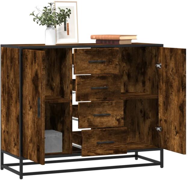Ez a klasszikus, ipari stílusú tálalószekrény kielégíti igényeit, és a helyiség nagyszerű kiegészítője lesz. Tartós anyag: A szerelt fa kivételes minőségű, sima felületű, szilárd, stabil, és ellenáll a nedvességnek. Bőséges tárolóhely: A büfészekrény elegendő helyet biztosít alapvető holmijai kézközelben történő rendezett tárolásához. Bemutatófunkció: A