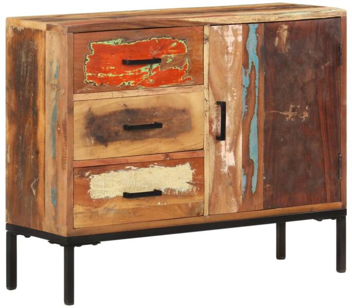 Ez a fa tálalószekrény otthona praktikus és bájosan dekoratív kiegészítője lesz. A szekrény tömör újrahasznosított fából készült, amelyet régi, lebontott épületek födémgerendáiból, padlóiból és tartógerendáiból állítottak össze, így környezetbarát megoldás a bútorgyártáshoz. Az újrahasznosított fa különböző fafajták, például a fenyő, a tík, a bü