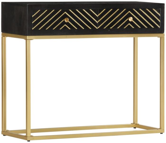 Ez a fekete és aranyozott bevonatú fa tálalóasztal örökzöld megjelenésű darabja lesz enteriőrjének. A tömör mangófából és erős acélból készült asztal rendkívül strapabíró. A mangófa egy trópusi keményfa, amely elbírja a ránehezedő súlyt és ellenáll az idő múlásának, így stabil és tartós. Az asztal szilárd teteje ideális vázák, szobanövények, illetve