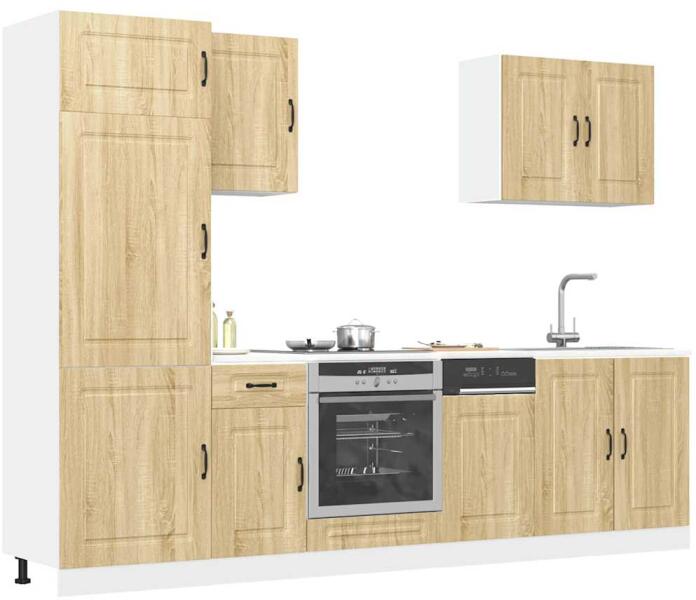 Ez az elegáns kialakítású, hétrészes konyhai szekrénygarnitúra optimalizálja konyhája terét, és bőséges tárolóhelyet biztosít személyes tárgyainak! Stabil és tartós anyag: A szerelt fa tartós és stabil anyag sima felülettel, amely ellenáll a nedvességnek, a vetemedésnek és a hasadásnak, így megbízható választás különféle célokhoz. Bőséges tárolóhely: A kon