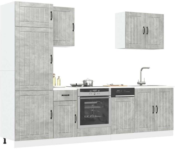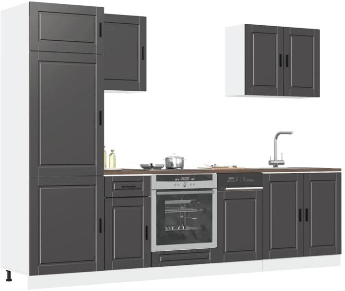 Ez az elegáns kialakítású, tizenegy részes konyhai szekrénygarnitúra optimalizálja konyhája terét, és bőséges tárolóhelyet biztosít személyes tárgyainak! Stabil és tartós anyag: A szerelt fa tartós és stabil anyag sima felülettel, amely ellenáll a nedvességnek, a vetemedésnek és a hasadásnak, így megbízható választás különféle célokhoz. Bőséges tárolóhely: