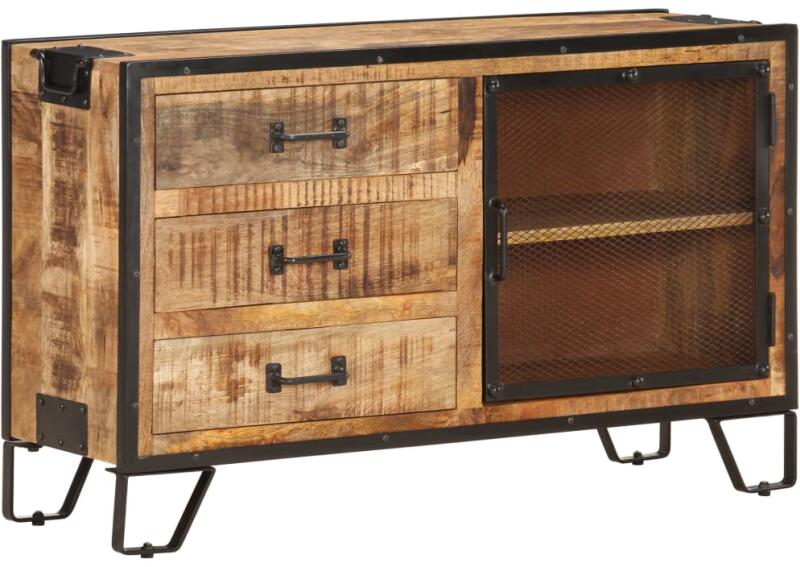 Ez az ipari stílusú fa komód otthona praktikus és dekoratív kiegészítője lesz. A tárolószekrény kézzel készült acélból és tömör nyers mangófából, így masszív és stabil. A kivitelezésnek és a fa gyönyörű erezetének köszönhetően minden bútordarab egyedi. Emellett a kisszekrény bőséges helyet biztosít fontos tárgyai rendezett és kézközelben való tárolásá