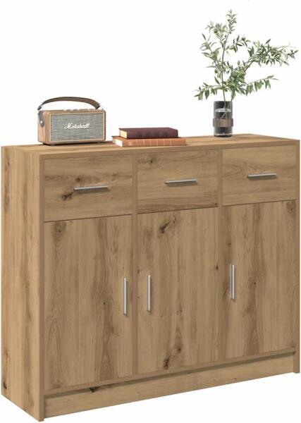 Csempésszen egy csipetnyi modern bájt otthonába ezzel a tálalószekrénnyel. Könnyen tisztítható anyag: A szerelt fa kivételes minőségű, sima felületű, szilárd, stabil és ellenáll a nedvességnek. A szerelt fából készült kisszekrény nedves ruhával könnyen tisztítható. Bőséges tárolóhely: A 3 fiókkal felszerelt szekrény bőséges tárolóhelyet kínál holmija rendeze