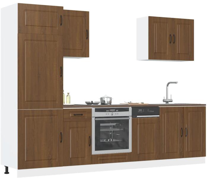 Ez az elegáns kialakítású, hétrészes konyhai szekrénygarnitúra optimalizálja konyhája terét, és bőséges tárolóhelyet biztosít személyes tárgyainak! Stabil és tartós anyag: A szerelt fa tartós és stabil anyag sima felülettel, amely ellenáll a nedvességnek, a vetemedésnek és a hasadásnak, így megbízható választás különféle célokhoz. Bőséges tárolóhely: A kon