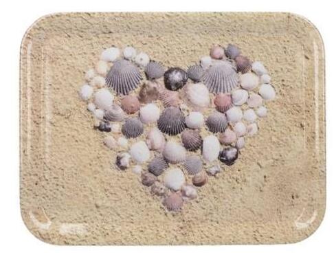 Homokos tengerpartot, romantikus nyári nyaralást felidéző mintájú műanyag tálca szives dekorral. Mérete: 29x22 cm. Minőségi melamin műanyag termék. Ajánljuk kerti partikhoz is, vagy stílusos tóparti nyaralókba.