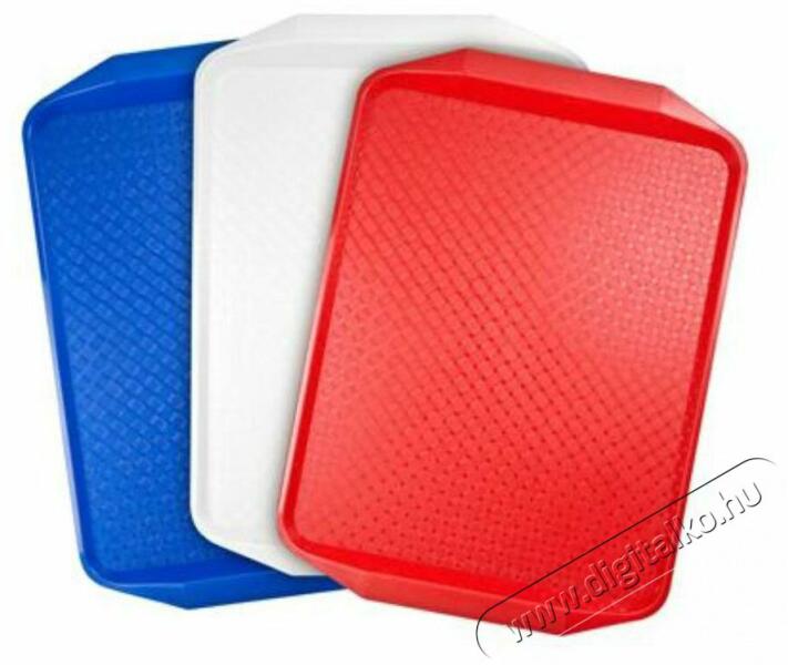 Műanyag tálca (PP), alkalmas gyorséttermekbe és étkezdékbe. Mosogatógépben mosható. Egymásra rakható.