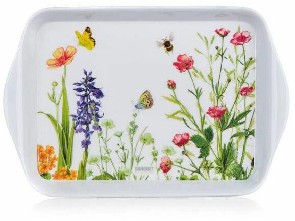 Kisméretű műanyag tálca hangulatos színes mezei virágos mintával. Reggelizéshez, teázáshoz - kávézáshoz remek választás. Mérete 21x14 cm. Anyaga: melamin. Ajánljuk húsvétra is.