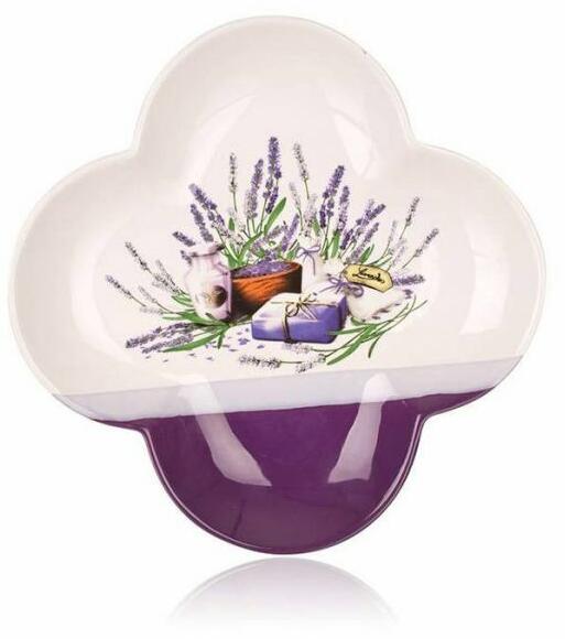 Dekoratív levendula mintás kínálótál. Átmérője 26 cm. Szín: lila/fehér. Mosogatógépben mosható, mikrohullámú sütőben használható.