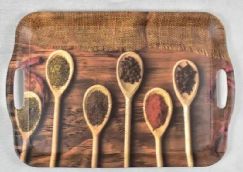 Ach Impex fakanalas-fűszeres mintájú füles tálca. Méret: 35,7 cm x 25,5 cm x 2,3 cm. Anyag: műanyag. Tisztítása során kerülje a karcosodást okozó szereket és eszközöket.