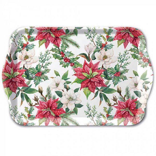 Szép mikulásvirágos mintájú, kisméretű műanyag tálca, mely remek alátét egy teázás/kávézás során. Ideális sütemények, apró finomságok vagy egyéb konyhai kiegészítők tálalására, illetve dekorációként is megállja a helyét a karácsonyi asztalon. A tálca könnyű, tartós műanyagból készült, így egyszerűen tisztítható és praktikus a mindennapi használatra.