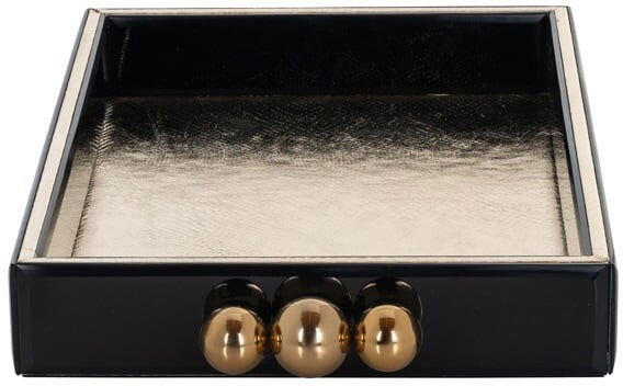 Elegáns, modern dekoratív tálca fekete kerettel és három arany gömb díszítéssel. A Richmond LIV tálca tökéletes kiegészítője bármely stílusos otthonnak, ötvözve a funkcionalitást és a kifinomult dizájnt. Elegancia és modern dizájn találkozásaA Richmond LIV dekoratív tálca a modern luxus megtestesítője. A fekete MDF keretbe foglalt üveg felület és a három arany gö