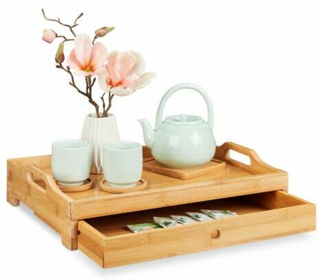 HIDEKI Bambusz Ágytálca, Fiókkal Reggeliző tálcaként és felszolgáló tálcaként egyaránt használható. Praktikus fogantyúkkal mindkét oldalán. Fiókos kialakításának köszönhetően a belsejében szalvéta, evőeszközök és más egyebek tárolhatóak A fiók igény szerint eltávolítható Teljes mérete: 10 x 43 x 31 cm (Ma x Szé x Mé) Fiók külső mérete: 5 x 40,5 x 30,5 c