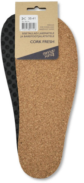 Méretre vágható, 3 mm vastag talpbetét parafából, aktív szén és latex alapon. A puha parafa réteg lágyítja a láb földre érkezését, a porózus felület pedig jól lélegzik, ezért izzadós lábúaknak is kellemes megoldás lehet. Az aktív szén alap természetes módon dezodorálja a cipőt, és kiváló csúszásgátló is. Nap végén tanácsos kivenni, és szabad levegőn, kö