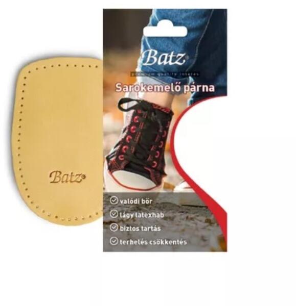 Batz 955 Sarokemelő párna. Sarokemelő párna bőr felsőrésszel, lágy, latex habból, öntapadós alsó résszel. Akár fél számmal korrigálhatja a cipő méretét. Megszünteti az alacsony sarkú cípő okozta bizonytalan tartást. Új lábbelikben csökkenti a kéreg okozta sarok irritációt. Női és férfi cipőkbe egyaránt javasolt.