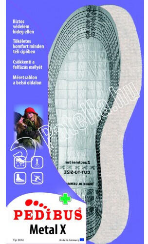 A Metal talpbetétek tökéletesen védenek a hideg ellen. Meleget biztosító szövet, rugalmas hab, valamint alumínium fóliából készült. A talpbetét ideális téli kiegészítője a cipőnek, mivel az anyaga segít melegen tartani a lábat, miközben az alumínium fólia véd a talaj hidege ellen. Kiszerelés: